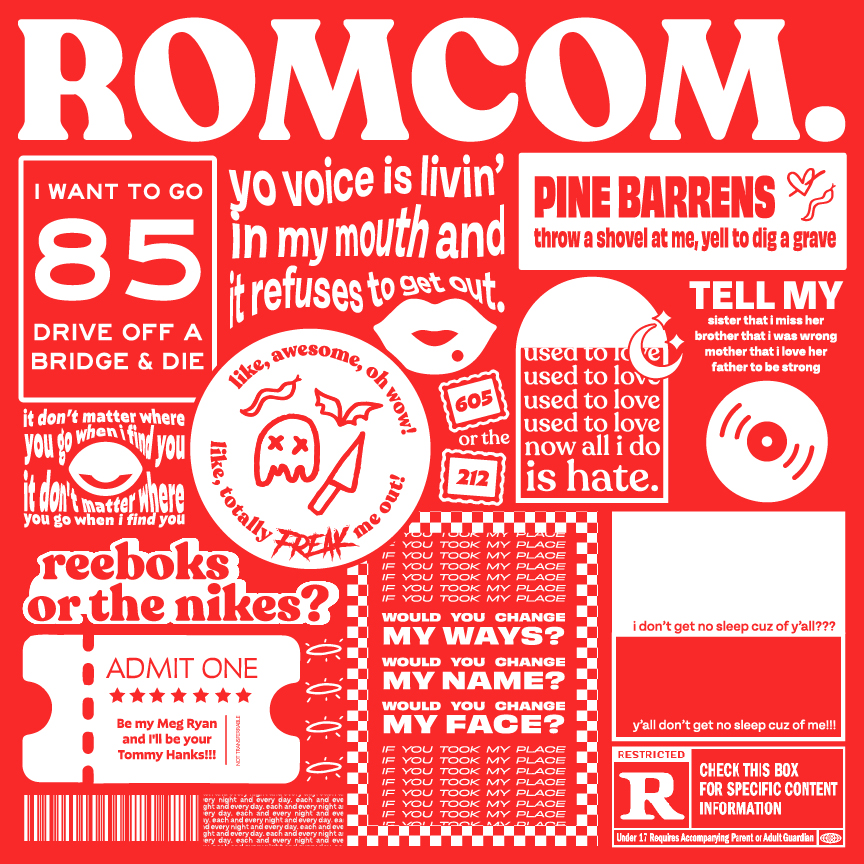 Poster and layout design for music album ROMCOM by Jakey. Incorporates numerous lyrical and visual motifs featured on the album and its promotional material.